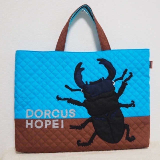 昆虫ギラファノコギリクワガタの アップリケ付きレッスンバッグ。 ギラファとはキリンを意味します。 細長く伸びた大あごをキリンの首に見立てて名付けられました。 可愛く、且つリアル風に出来上がりました。 受注制作です。 2枚目写真イメージです。 【仕様】 縦30m、横40cm、マチ4cm 綿キルティング使用 裏地 ブロード、内ポケットあり 持ち手の長さ 約32cm(学校机に掛けて床に着かない長さ)持ち手頂点からバッグ底まで約42cm アップリケ ウォッシャブルフェルト使用 ハンドメイド品 入園入学アイテム、学用品、絵本バッグ、お稽古、お出かけ 洗濯すると縮みます。 丸洗いは避けて汚れた部分を洗う事をお勧めします。 【Specifications】 Height: 30cm, Width: 40cm, Depth: 4cm Material: Cotton quilting Lining: Broadcloth, with inner pocket (fabric will be changed to a darker gray) Handle Length: Approximately 32cm (designed to hang on a school desk without touching the floor), from the top point of the handle to the bottom of the bag is approximately 42cm Applique: Washable felt Handmade item Ideal for school entrance, school supplies, picture book bag, extracurricular activities, outings It shrinks when washed Do not wash the whole product. Wash only the dirty parts.