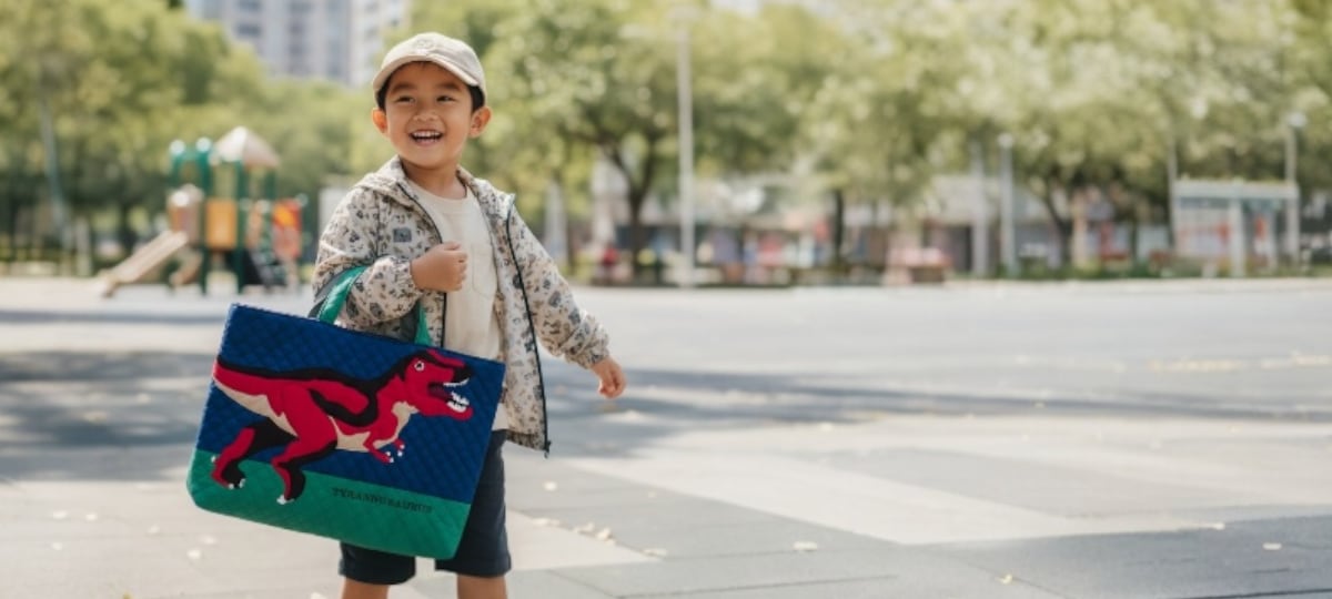 彼はその恐竜のバッグを持って幼稚園に通い始め、