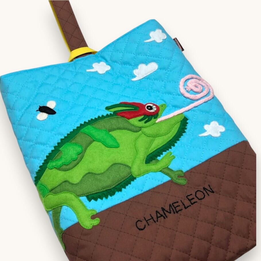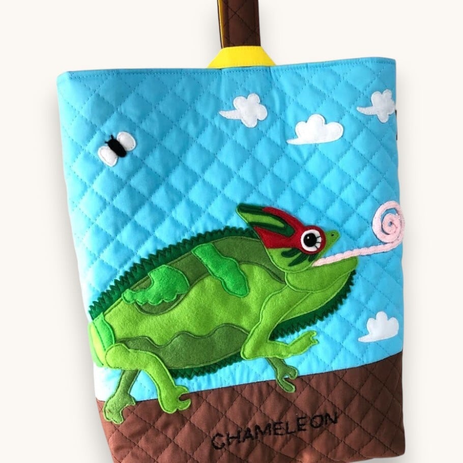 A bright and playful shoe bag featuring a cute chameleon appliqué.