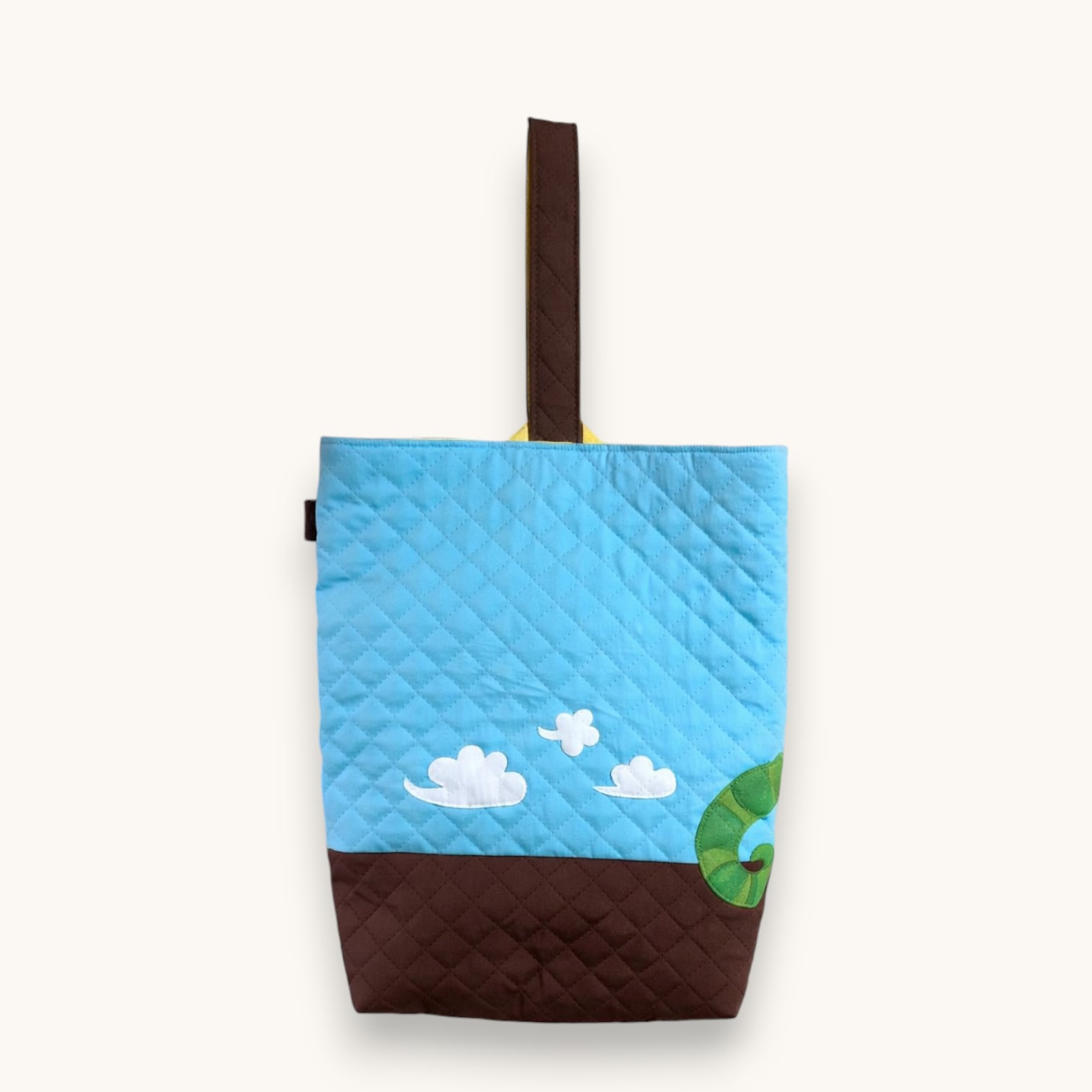 The sky-blue quilted fabric with fluffy clouds and the curled green tail peeking out on the back add a fun touch kids will love.