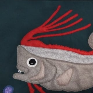 アップリケが裏側にはみ出ないように表面にきっちり収まるように作ったので、潜水艦の窓から深海を覗いて見ている様な感覚になっていただけたら嬉しいです。